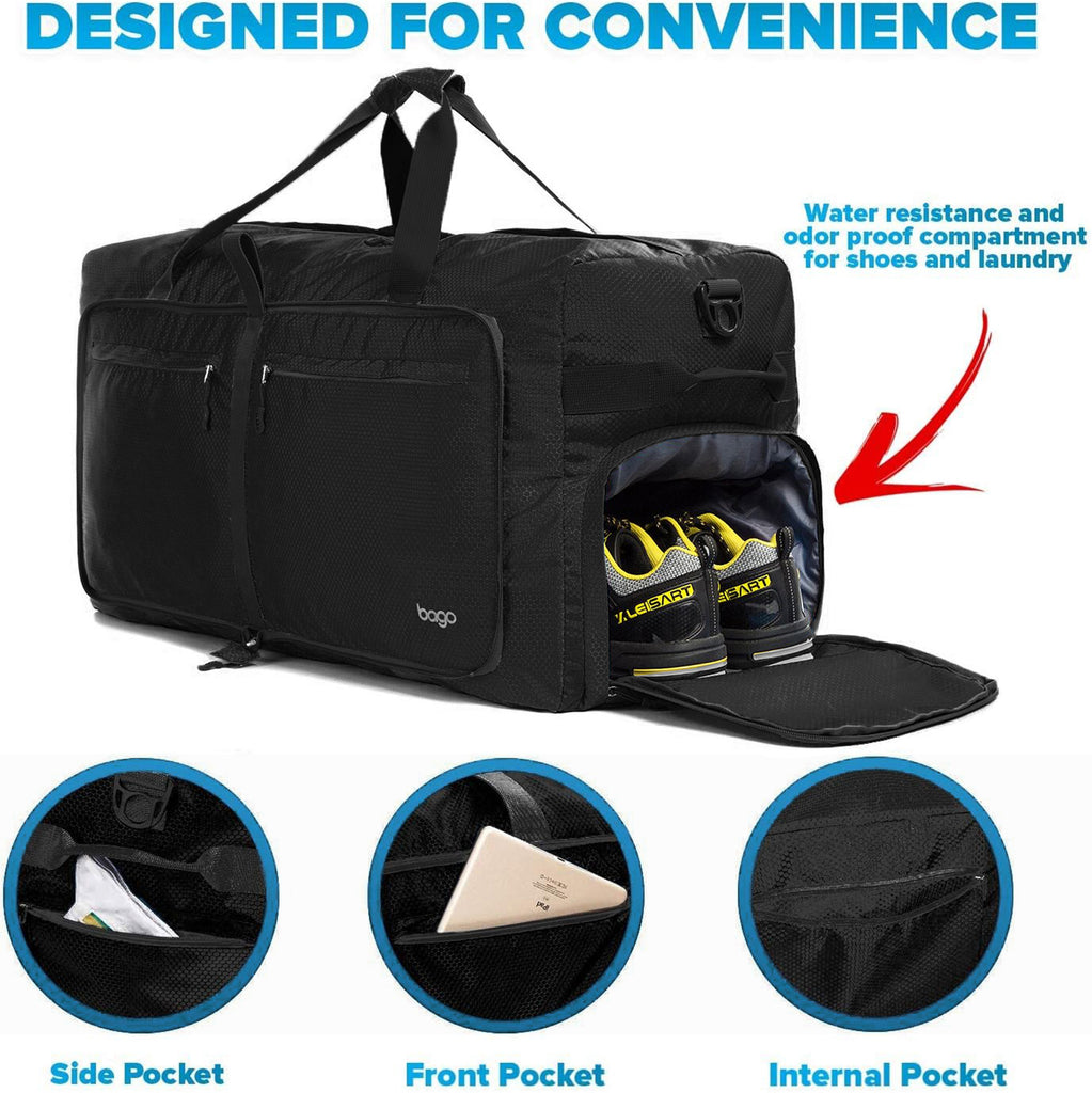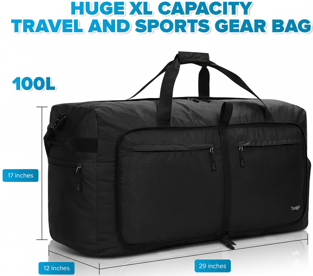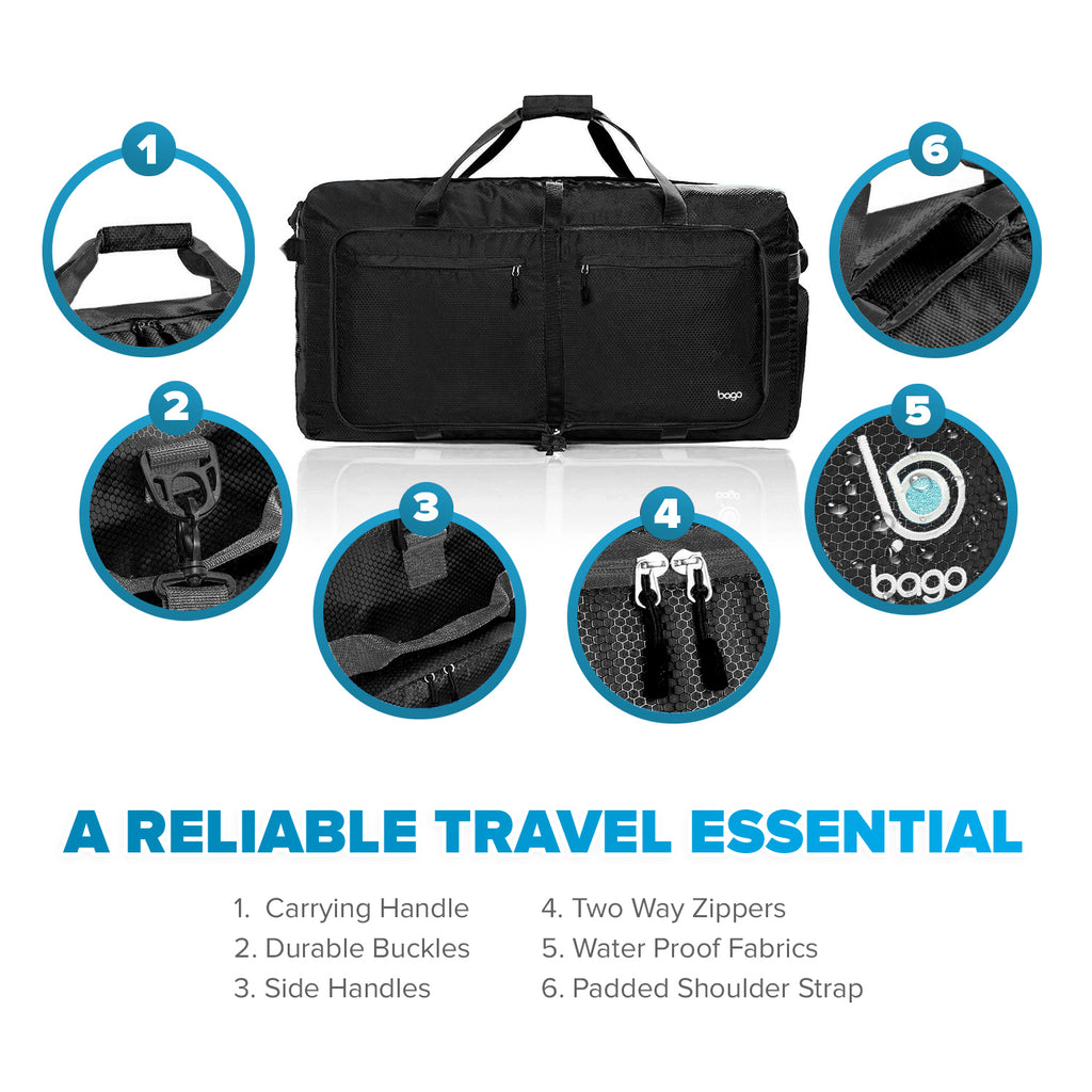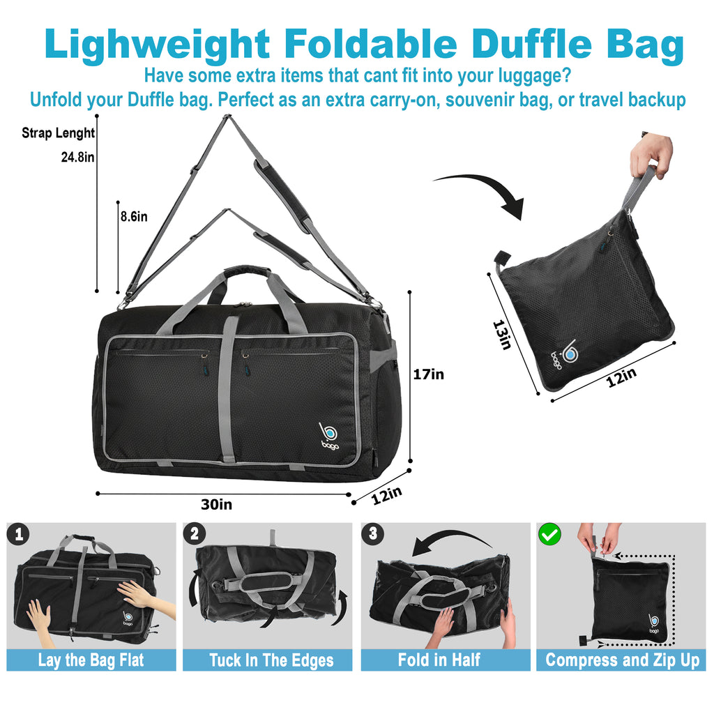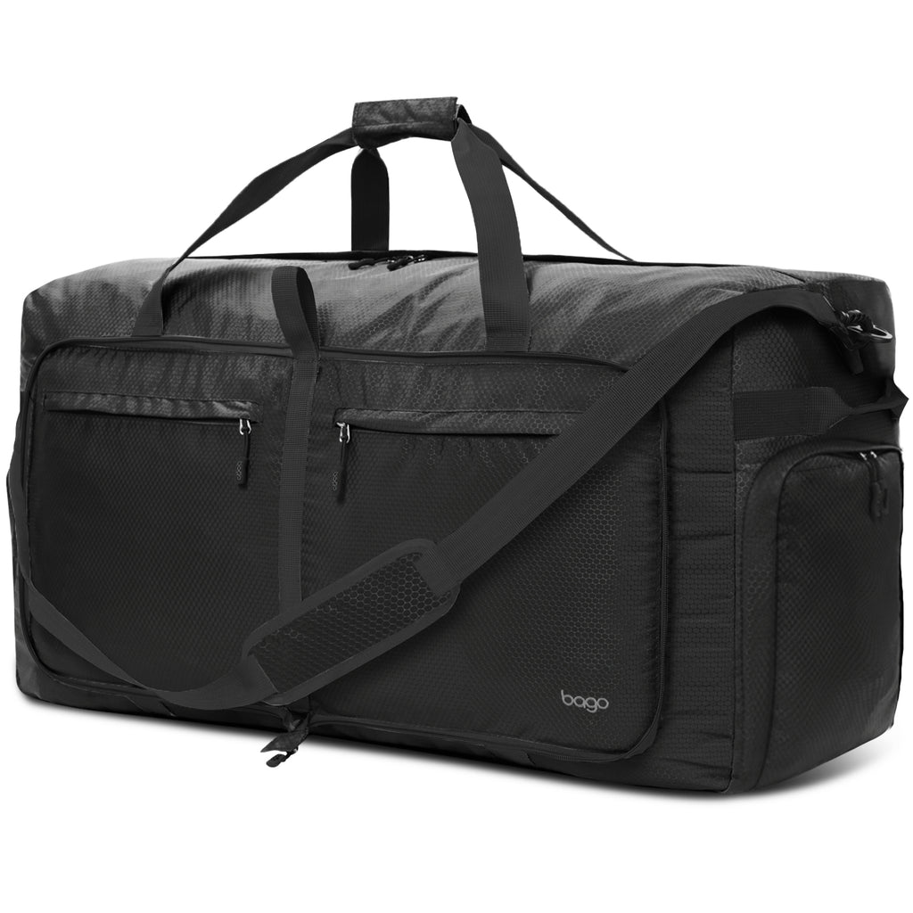 GET THE SPACE OF A LARGE SUITCASE WITHOUT THE BULK AND WEIGHT lightweight, foldable and compact; ; Extra Large Duffle Bag 29 inches 100 Litres capacity, weighs 75% less than your empty suitcase (only 1.6 Pound) & weighs 75% less than your empty suitcase (only 600 gram). Use at home to store and carry your sports gear or other large items. This Packable Duffle is Designed to work best with BAGO PACKING CUBES - Add both to your cart for an organised lightweight travel experience.