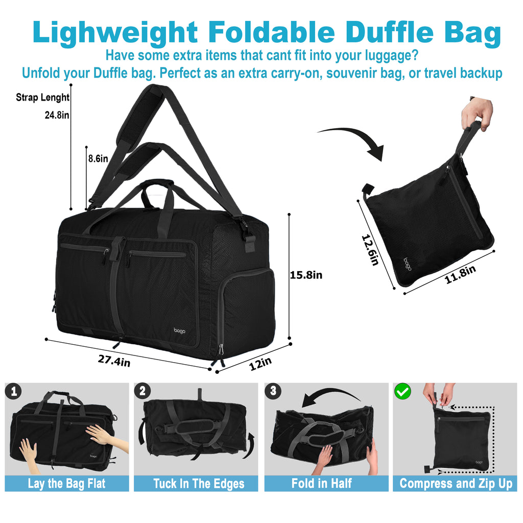 GET THE SPACE OF A LARGE SUITCASE WITHOUT THE BULK AND WEIGHT lightweight, foldable and compact; ; Large Duffle Bag 27 inches 80 Litres capacity, weighs 75% less than your empty suitcase (only 0.9 Pound) Medium Duffle Bag; 53 Litre & weighs 60% less than your empty suitcase (only 600 gram). Use at home to store and carry your sports gear or other large items. This Packable Duffle is Designed to work best with BAGO PACKING CUBES - Add both to your cart for an organised lightweight travel experience.